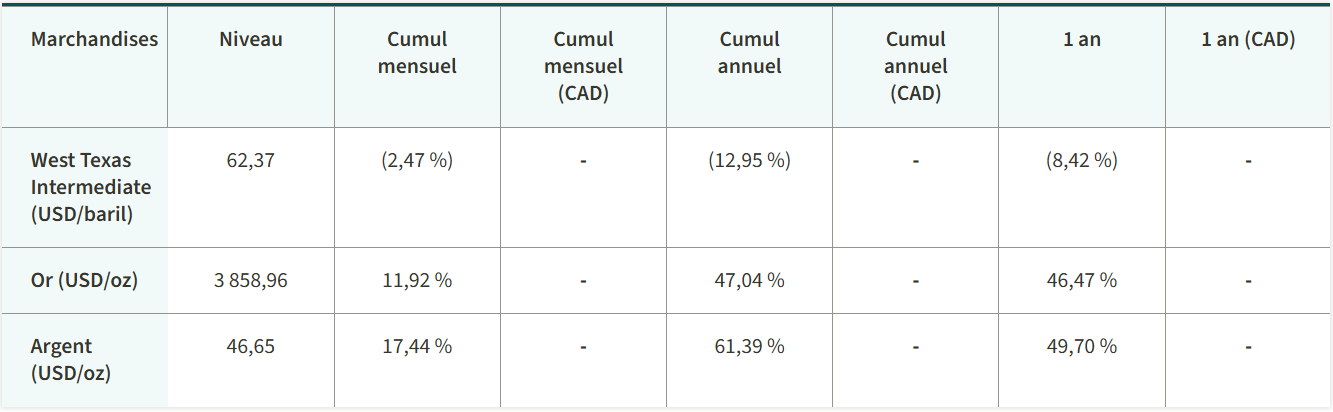 Le prix de l’or n’a cessé d’atteindre de nouveaux records en septembre. Dans une économie mondiale aux prises avec l’incertitude causée par les bouleversements commerciaux, les tensions géopolitiques et de sombres perspectives en matière d’inflation, les investisseurs se sont tournés vers cette valeur refuge. Plusieurs facteurs ont fait monter le prix de l’or en septembre, le premier étant l’incertitude économique persistante. En période d’incertitude, la demande pour l’or augmente et son prix également. Au fil du mois, la perspective que la Fed sabre dans les taux d’intérêt à sa rencontre de septembre s’est intensifiée, même si cette réduction risquait d’ajouter aux pressions inflationnistes. Simultanément, le dollar des États-Unis s’est affaibli à cause des préoccupations suscitées par les tensions commerciales et l’économie des États-Unis. Le prix de l’or s’est envolé lorsque certains rapports ont laissé entendre que la Chine aspirait à devenir dépositaire des réserves d’or souveraines étrangères. L’industrie de l’extraction d’or du Canada, un acteur majeur sur le marché mondial, a tiré profit de la flambée du prix de l’or. Et cela s’est réfléchi sur le cours des entreprises du secteur des matériaux, qui s’est hissé de 19 % en septembre et de 78 % d’une année sur l’autre. Le prix de l’or a gagné 12 % en septembre, pour atteindre plus de 3 800 $ US pour la toute première fois.