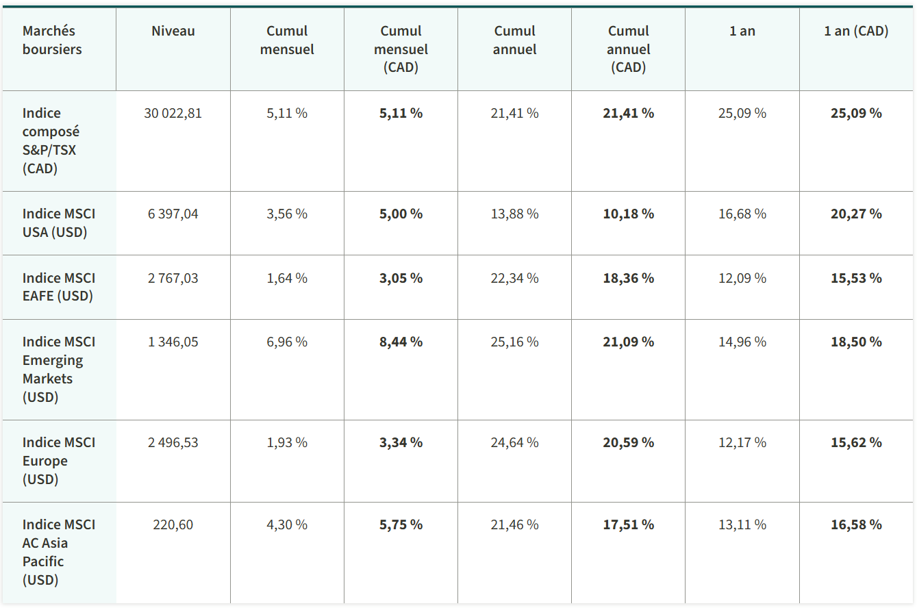 Les marchés ont progressé en septembre, soutenus par des baisses de taux et un ralentissement de l’inflation. Les actions canadiennes et américaines ont atteint des sommets historiques, le secteur des matériaux affichant les meilleurs gains. Le prix