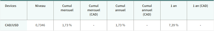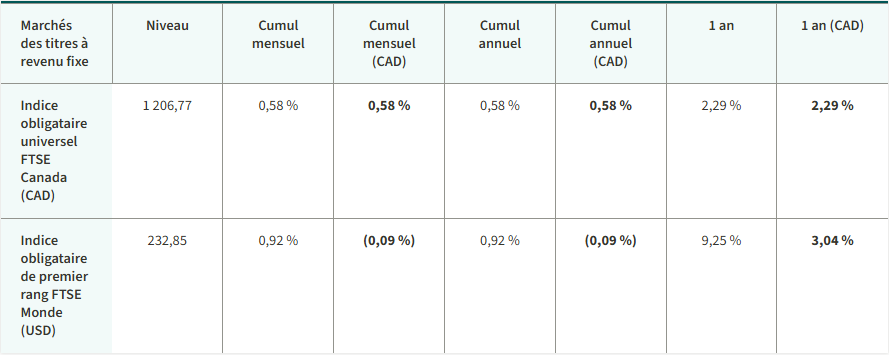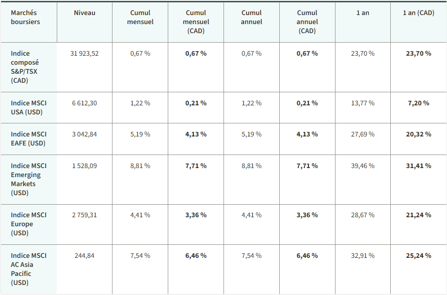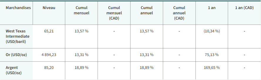 L’indice composé S&P/TSX a grimpé jusqu’à établir un nouveau record. Le secteur qui a le mieux fait a été celui de l’énergie. Les actions états-uniennes ont monté. Le rendement des obligations gouvernementales à 10 ans du Canada est resté le même et celui des bons du Trésor des États-Unis a augmenté. Le pétrole et l’or ont coûté plus cher en janvier. Notamment, l’or, de même que l’argent et le cuivre ont atteint un sommet inégalé.